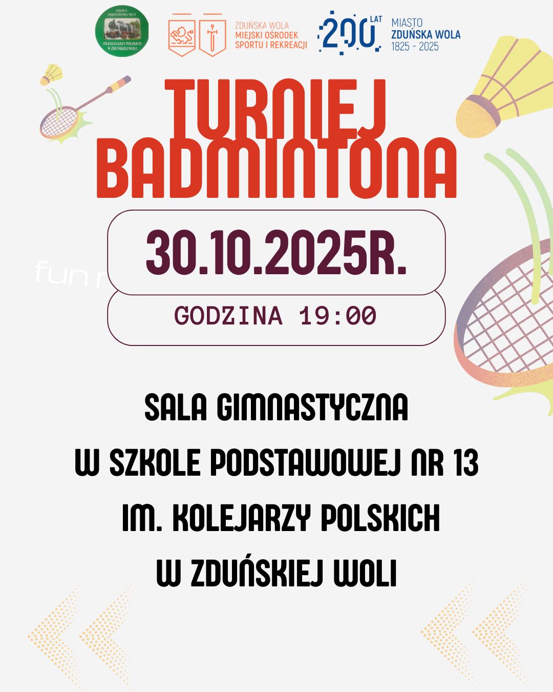 Zapraszamy do Szkoły Podstawowej nr 13 na turniej badmintona dla dorosłych w czwartek 30. 10.2025 r. godz. 19.00