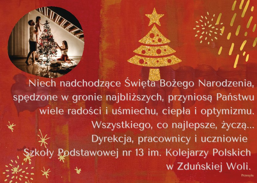 Niech nadchodzące Święta Bożego Narodzenia, spędzone w gronie najbliższych, przyniosą Państwu wiele radości, uśmiechu, ciepła i optymizmu. Wszystkiego, co najlepsze życzą: Dyrekcja, pracownicy i uczniowie Szkoły Podstawowej nr nr 13 im. Kolejarzy Polskich w Zduńskiej Woli